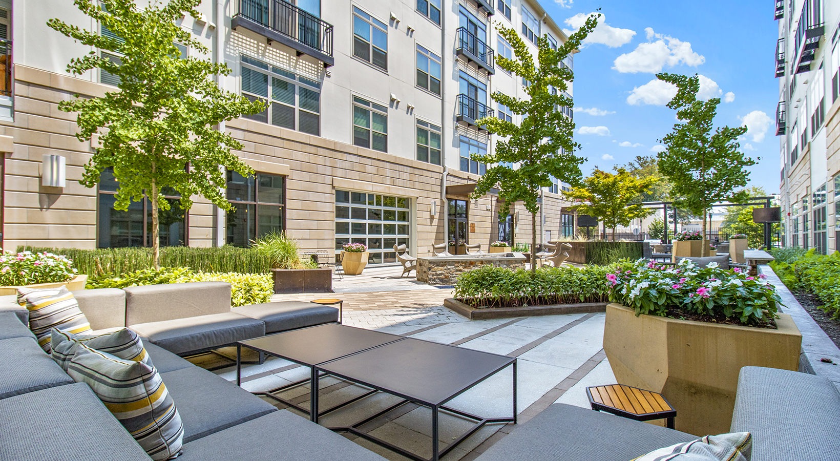 • An outdoor courtyard at Vista Wilde Lake featuring lounge seating, dining tables, and planters with flowers, surrounded by modern apartment buildings and greenery